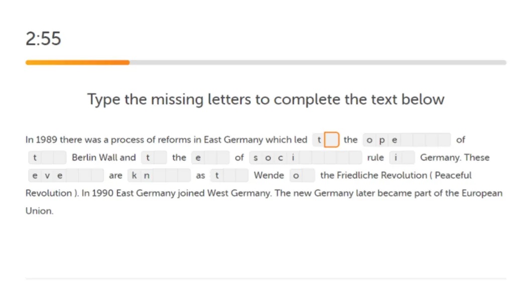 در این بخش از آزمون Duolingo باید جاهای خالی با حروف مناسب تکمیل کنید. هدف این نوع سوالات بررسی میزان درک انگلیسی شما از متن است. اگر متن را متوجه نمی‌شوید، اشکالی ندارد. سعی کنید کلماتی که مناسب جمله هستند حدس بزنید.